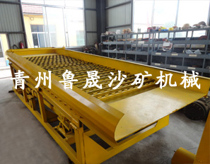 第二種小型的沙金機器 小型的沙金溜槽,這種小型的沙金溜槽上方有料斗和隔壁篩,可以將石塊隔離出去。把石頭隔離出去,含沙的礦料進入下方的沙金溜槽進行黃金的回收。這種沙金溜槽回收率比較高。自動化程度比較高,是現在比較普遍使用的小型沙金機器。