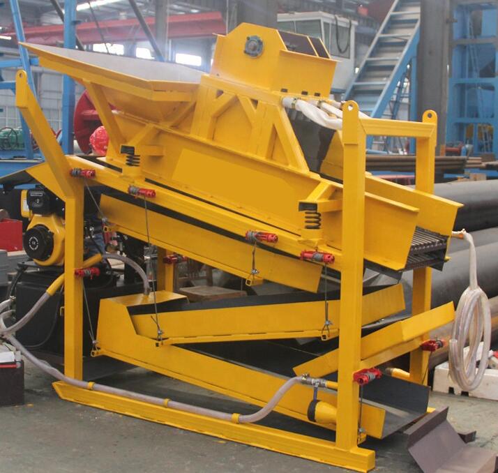 第二種小型的沙金機(jī)器 小型的沙金溜槽,這種小型的沙金溜槽上方有料斗和隔壁篩,可以將石塊隔離出去。把石頭隔離出去,含沙的礦料進(jìn)入下方的沙金溜槽進(jìn)行黃金的回收。這種沙金溜槽回收率比較高。自動化程度比較高,是現(xiàn)在比較普遍使用的小型沙金機(jī)器。 這幾種小型的沙金機(jī)器可以根據(jù)礦區(qū)和礦料的不同來選擇,很多客戶選擇小型的設(shè)備是主要用于探礦或者是小型小范圍的開采, 有了收益后再上大型的開采設(shè)備。現(xiàn)在這幾種設(shè)備在非洲、南美洲等多個地區(qū)應(yīng)用比較廣泛。砂金回收設(shè)備